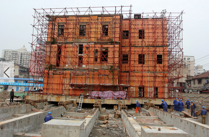 據了解,建筑物年代久遠,為了保證移動時不散架,必須要求基礎的加固工程做得更細致。水泥托盤是在房屋地基被掏空后,用液壓千斤頂將小樓抬高1.4米,用鋼筋混凝土澆筑而成。這樣,平移時的受力點也都在“托盤”上,而不在樓體建筑上。經過反復推算,后將平移速度設置在每小時70厘米。