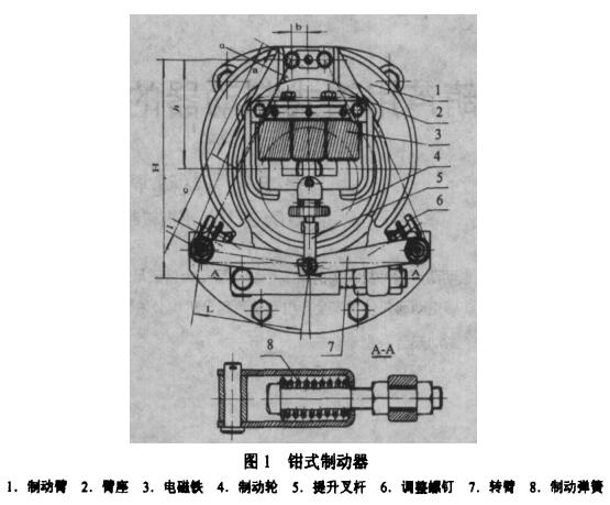 鉗式制動器結構如圖1.它的主要制動臂1、臂座2、電磁鐵3、制動輪4、轉臂7和制動彈簧8組成。它是常閉式制動器,通電時起升電動機旋轉,輸力矩起吊載荷,同時制動器電動器電磁鐵吸合,打開制動器;切斷電源時,起升電機制動,鉗式制動器電磁鐵打開,制動臂在彈簧力的作用下抱緊制動輪制動載荷,電磁鐵是長行程電磁鐵。