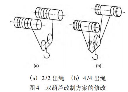 可知,當鋼絲繩直徑和滑輪直徑確定后,鋼絲繩之間距離越大,能夠正常起升的大高度越高。這樣,可通過在吊鉤組水平方向增加滑輪的方式增大L值,來避免鋼絲繩纏絞的現象。雙葫蘆改制方案中的2 /2和4 /4出繩方案可變為圖4所示的結構。
