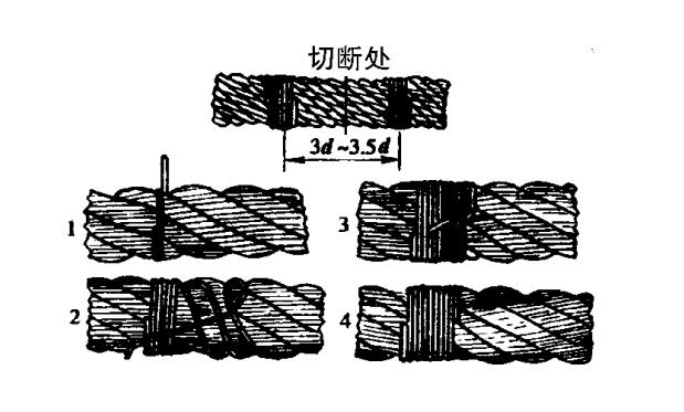上圖所示為扎結(jié)鋼絲位置、順序。對于扎結(jié)鋼絲的道數(shù)應(yīng)為:用于麻芯鋼絲繩時為1道;鋼芯時為4道。