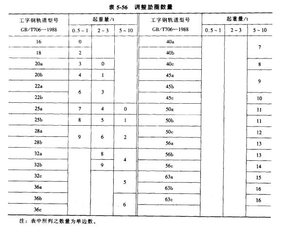 3、由于廠房跨度大小不一,選用工字梁軌道大小不同,因此走輪組件在安裝時應隨工字梁軌道的寬度,用調整墊圈進行調整(見圖5.48),調整墊圈數量如表5.56所示。