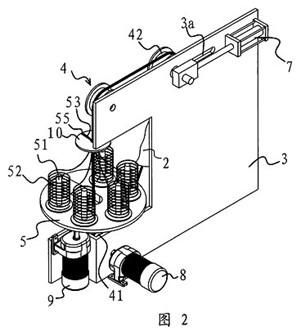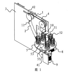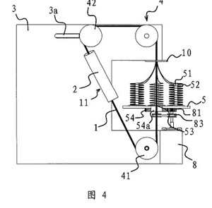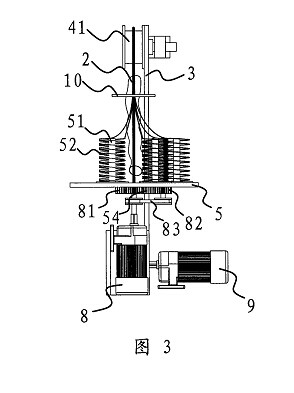 一種環形穿絲吊裝帶的生產裝置,它包括一塊固定板(3),在固定板(3)上設有用于撐開環形穿絲吊裝帶(11)的滾輪組(4),滾輪(41)驅動裝置與其中至少一個滾輪(41)相聯并可通過該滾輪(41)帶動環形絲吊裝帶(11)轉動,其特征在于,所述的固定板(3)的側部設有一個轉盤(5),在轉盤(5)上設有若干個用于放置線團(52)的線架(51),轉盤(5)具有一個供撐開在滾輪組(4)上的環形穿絲吊裝帶(11)進入并垂直穿過轉盤(5)中心的缺口(53),上述轉盤(5)與一個當撐開在滾輪(41)組(4)上的環形穿絲吊裝帶(11)轉動時可帶動轉盤(5)上的各個線架(51)繞環形穿絲吊裝帶(11)轉動的轉盤(5)驅動裝置相聯接,所述的轉盤(5)驅動裝置包括一個與電機一(8)相聯的主驅動齒輪(81),在轉盤(5)的底部中心設有一個與主驅動齒輪(81)相嚙合的轉動齒輪(54),轉動齒輪(54)具有與轉盤(5)上的缺口(53)上下對應的開(54a),在轉動齒輪(54)旁還設有一個副驅動齒輪(82),所述的副驅動齒輪(82)通過同步傳動帶(83)與主驅動齒輪(81)相連。