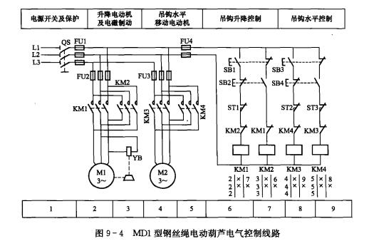 MD1型鋼絲繩電動(dòng)葫蘆是一種輕小型起重設(shè)備。它可以飯莊在葫蘆單梁、橋式起重機(jī)、門式起重機(jī)、懸掛起重機(jī)等機(jī)械上,實(shí)現(xiàn)精密裝卸、砂箱合模、機(jī)床檢修等精細(xì)作業(yè)。MD1型鋼絲繩電動(dòng)葫蘆電氣控制線路如圖9-4所示。