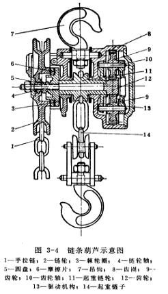 圖3-4為齒輪式手拉鏈條葫蘆。當提升重物時,手拉鏈1使鏈輪2按順時針方向轉動。鏈輪2沿著圓盤5套筒上的螺紋向里一動,而將棘輪圈3和摩擦片6都壓緊在鏈輪軸4上(鏈輪軸4與圓盤5牢固形成一體),棘輪圈3只能順時針方向轉動,棘爪在棘輪圈3上跳動發出嗒嗒之聲。鏈輪軸4右端的齒輪12帶動齒輪9(或稱行星齒輪)與固定齒圈8相嚙合,使齒輪9沿鏈輪軸4為中心順時針方向移動。同時帶動驅動機構13和起重鏈輪11轉動,使起重鏈子14上升。當不拉手拉鏈之后,重物是靠自重產生的自鎖現象和棘爪組織棘輪圈3逆時針方向轉動而停止在空中。反之,當松下重物時,手拉鏈1使鏈輪2和圓盤5分離。則鏈輪軸4右端的齒輪12帶動齒輪9與固定齒圈8相嚙合,使齒輪9沿鏈輪軸4為中心逆時針方向轉動,同時帶動驅動機構13和起重鏈輪11轉動,使起重鏈子14下降。當不拉手拉鏈之后,因鏈輪2停止轉動時,起重鏈輪11受重物自重還要繼續沿逆時針方向轉動,行星齒輪傳動機構同樣沿逆時針方向繼續轉動,使圓盤5、摩擦片6及棘輪圈3相互之間相互壓緊而產生摩擦力,棘輪圈3受棘爪阻止不能向逆時針方向轉動,于是摩擦力作用在螺紋上產生自鎖,使重物停止在空中。