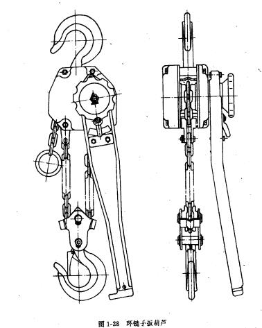 環鏈手扳葫蘆的結構如圖1-28所示,它采用一級齒輪轉動,主要有齒輪軸、齒輪、制動器、起重鏈條、鏈輪、吊鉤、操作手柄等。