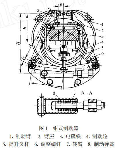 它主要由制動(dòng)臂1、臂座2、電磁鐵3、制動(dòng)輪4、轉(zhuǎn)臂7和制動(dòng)彈簧8組成。為常閉式制動(dòng)器,通電時(shí)起升電動(dòng)機(jī)旋轉(zhuǎn),輸出力矩起吊載荷,同時(shí),制動(dòng)器電磁鐵吸合,打開制動(dòng)器;切斷電源時(shí),起升電機(jī)制動(dòng),鉗式制動(dòng)器電磁鐵打開,制動(dòng)臂在彈簧力作用下抱緊制動(dòng)輪制動(dòng)載荷。電磁鐵是長行程電磁鐵。