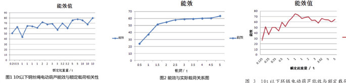 在對不同規(guī)格,不同型號的環(huán)鏈電動葫蘆的能效值進行對比的同時,還收集了同1臺葫蘆在從輕載到額載工況下,能效隨試驗載荷變化而變化的試驗數據。經過對數據的分析,圖2列舉了一臺5t的雙速環(huán)鏈電動葫蘆能效隨載荷變化的變化曲線,此曲線具有廣泛代表性。根據曲線趨勢,可得出以下結論,鋼絲繩電動葫蘆在吊載不足30%額定起重量的載荷時,其能效值很低,大量能量均被浪費,當吊載重物超過30%額定起重量的載荷時,電動葫蘆的能效值會有顯著提升,并逐漸趨于高能效值,直至吊載重物超過50%額定起重量,能效值變化非常微小,趨于穩(wěn)定。