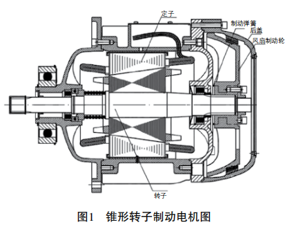 錐形轉子制動電機其定子內腔和轉子外形均為圓錐形,轉子的每一個矽鋼片直徑都不相同,制動彈簧只有一根,制動輪和摩擦片均為環狀的圓錐面結構。電機定子通電后產生旋轉磁場,同時由于錐形結構而產生軸向磁拉力,使轉子軸向移動并壓并彈簧,使風扇制動輪與錐形摩擦片分離,制動消失,轉子開始轉動,電機運行。定子斷電后,旋轉磁場和軸向磁拉力消失,電機轉矩消失,轉子在彈簧作用下連同風扇制動輪一起復位,使風扇制動輪壓緊在摩擦片上產生摩擦力矩,使電機減速停止實現制動。錐形轉子制動電機的結構如圖1所示。錐形轉子制動電機的特點如下: