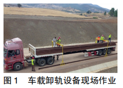 從設備的耐用性出發,設備需要結構簡單,操作簡單,維修方便,制作維護成本低,從設備的安全性出發,設備需要滿足長途運輸過程中自身不脫落車體,并且滿足在裝卸鋼軌過程中的承重能力達到要求,從設備的快速機動性出發,起重裝置需采用電力驅動,以提升起重升降的效率。另外設備的運行狀態需 要針對鋼軌運輸過程中的各種狀態快速切換,如在基 地裝車鋼軌時不能影響大型龍門吊作業,運至現場后 快速切換至卸軌作業狀態,作業狀態中卸軌后行進至下一卸軌里程點的短程行進狀態與裝卸狀態能夠快速切換,根據上述需求,從實際情況出發,項目所使用的運軌設備是兩臺國內采購的可伸縮平板車,縮合狀態時長度為12m可用于運送軌枕,最大伸長狀態時長度為18m 用于運送鋼軌,則需要將卸軌設備與平板車結合起來。參照已有的大型龍門架,可以在平板車上設計一 個縮小版的門架式體系,平板車頂面兩側設有數個插槽,原本是為防止運輸中鋼軌脫落放置立柱使用,現可借助該立柱,輔以一根橫梁以及一根立于地面的支柱,形成一個門架式體系,門架式體系形成后,模仿基地裝卸鋼軌的大型龍門吊,在橫梁上安裝一個可以滑動的電動葫蘆,在車尾處安裝一臺發電機以提供動力。在鋼軌上選取兩個吊點設置兩組門架體系,使用裝在橫梁上電動葫蘆的夾具,即可成功達到裝卸鋼軌的目的,如圖1所示。