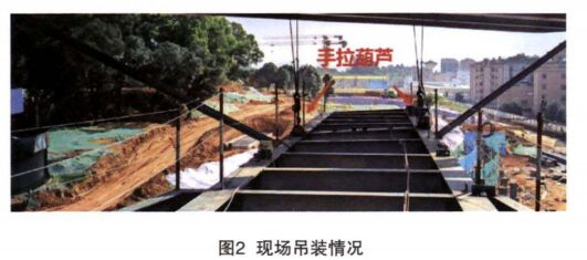 (4)吊裝工具進(jìn)場驗(yàn)收。手拉葫蘆是主要的吊裝工具,手拉葫蘆進(jìn)場前,復(fù)核葫蘆的額定起重量是否滿足要求,查驗(yàn)相關(guān)的合格證和檢驗(yàn)報(bào)告。本項(xiàng)目吊裝的懸挑結(jié)構(gòu)單根主梁最大重量11t,考慮一端固定一端懸挑,懸挑端采用額定起重量為10t的手拉葫蘆可以滿足要求。驗(yàn)收進(jìn)場的鋼絲繩直徑是否符合方案的要求,是否有起毛、斷絲、磨損的情況。如果有異常,驗(yàn)收卸扣規(guī)格尺寸等能否滿足吊裝要求用。