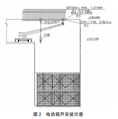 在抽水蓄能電站地下廠房土建及機(jī)電設(shè)備安裝施工過程中,因施工場地空間受限,導(dǎo)致材料垂直運輸通道單一影響現(xiàn)場施工進(jìn)度。為解決此類問題,利用電動葫蘆具有體積小、自重輕、操作簡單、使用方便等特點,采用在副廠房頂拱巖體位置安裝電動葫蘆、副廠房各樓層預(yù)留吊物孔的方式,形成副廠房臨時垂直運輸通道,滿足土建施工期模板、腳手架。機(jī)電設(shè)備安裝期空壓機(jī)氣罐、電氣盤柜等材料設(shè)備的轉(zhuǎn)運,有效利用現(xiàn)場施工空間。從而達(dá)到提升施工效率、降低現(xiàn)場施工強度及節(jié)約施工成本的目的。