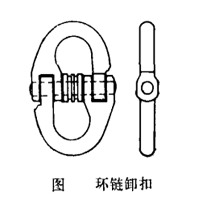 圖中a是U型帶鎖緊螺母卸扣,適于在高處或不易發(fā)現(xiàn)其松脫處使用;b為馬蹄形卸扣,具有較大的環(huán)腔;c是帶滾輪卸扣;d是長環(huán)腔卸扣,適合于不同的使用條件。國外還應用一種適合于鏈條作業(yè)用的卸扣,下圖是瑞典公司生產(chǎn)的鏈環(huán)卸扣,用它可以靈活地調整鏈條索具的分支或更換夾具。